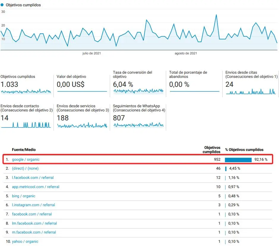 En todo caso, al tener sitio web, no basta solo con publicarlo y esperar que funcione. Una adecuada estrategia SEO requiere también análisis de los datos para mejora regular. Por ejemplo, este es un pantallazo de Google Analytics de uno de nuestros clientes, donde se ve que la gran mayoría de sus conversiones en sitio web (92,16%) provienen de Google, tráfico orgánico, además de los distintos objetivos de conversión que están siendo medidos: